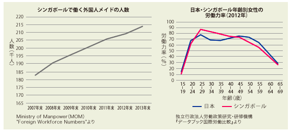 シンガポール政府は、シンガポールの女性の労働人口を増やすことを目的に、1978年に「外国人メイド計画」を立ち上げ、働く女性の代わりに家事や育児を担う移民の許可を拡大した。1978年当時、約5,000人だったメイドの数は、2007年末に18万3,200人、2013年末には21万4,500人と年々増え続け、現在では、約5世帯に1世帯が雇用。2003年に50.9%だった女性(15歳以上、国民と永住者)の労働力率も、2013年に58.1%へと上昇。日本と比べて子育て世代の落ち込みも少ない。この政策が女性の社会参加を促す後押しになったと言われている。