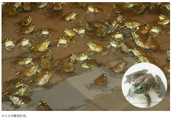 おたまじゃくしから赤ちゃんカエルになるまでに4ヵ月、そして生後9ヵ月で大人のカエルになり、生後1年以内に出荷します。餌は魚肉配合飼料を使っています。