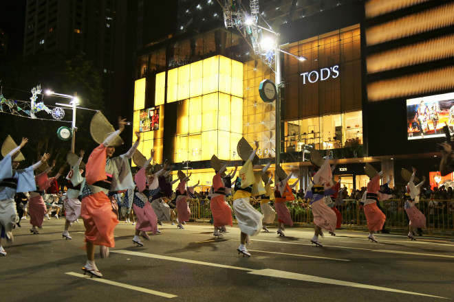 ニーアンシティのシビックプラザで開催されたSJ50の目玉イベント。日系企業や地方自治体を中心に観光や物産に関する展示や即売、商品PRが行われたほか、会場に設けられたステージでは、日本の伝統芸能やポップカルチャーなどをテーマにした各種アトラクションが催されました。29日の夜にはオーチャード・ロードを閉鎖してフレンドシップパレードが行われ、在シンガポールの日本人グループや日系企業の職員ら約2,000人が参加。「恋するフォーチュンクッキー」や「世界に一つだけの花」が流れる中、篠田研次大使とジョセフィン・テオ上級国務相が先頭に立ちオーチャード・ロードを行進、その後は阿波踊りも行われ、沿道には多くの人が集まり両国の友好を祝いました。
