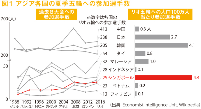 さてシンガポールの夏季五輪への参加状況を見ると興味深い事実が浮かび上がってくる。大会ごとに参加する選手数が高い割合で増加していることに加えて、2016年のリオ五輪に参加した選手数を人口規模と比較してみると、シンガポールは人口100万人当たりで4.4人と、アジアで最大の「オリンピアン密度」を誇っている(図1)。