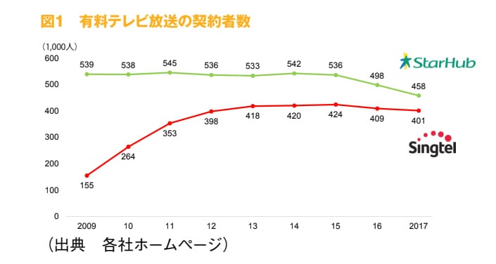 シンガポールの通信大手2社が提供する有料テレビ放送の契約者数の推移を見てみる(図1)。StarHubの契約者数はピーク時の2014年末の54万2,000人から2017年末には45万8,000人、Singtelの契約者数はピーク時の2015年末の42万4,000人から2017年末には40万1,000人と、2社合計でここ数年の間に約10万7,000人もの契約者を失っている。