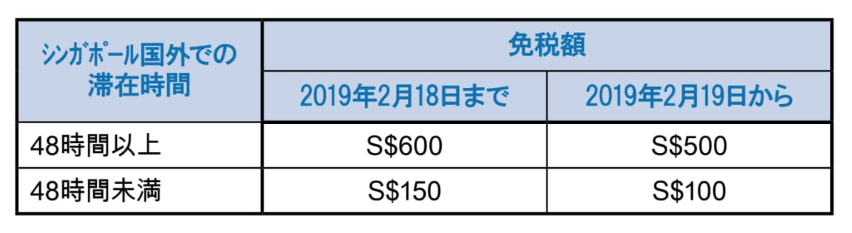 旅行者がシンガポール国外で購入してシンガポールに持ち込んだ商品は、原則としてシンガポールへの商品の輸入として取り扱われ、入国時に税関に申告する義務がありますが、一定の限度額までの商品は免税とされています。2019年2月19日午前0時より、免税額が下記のように減らされました。