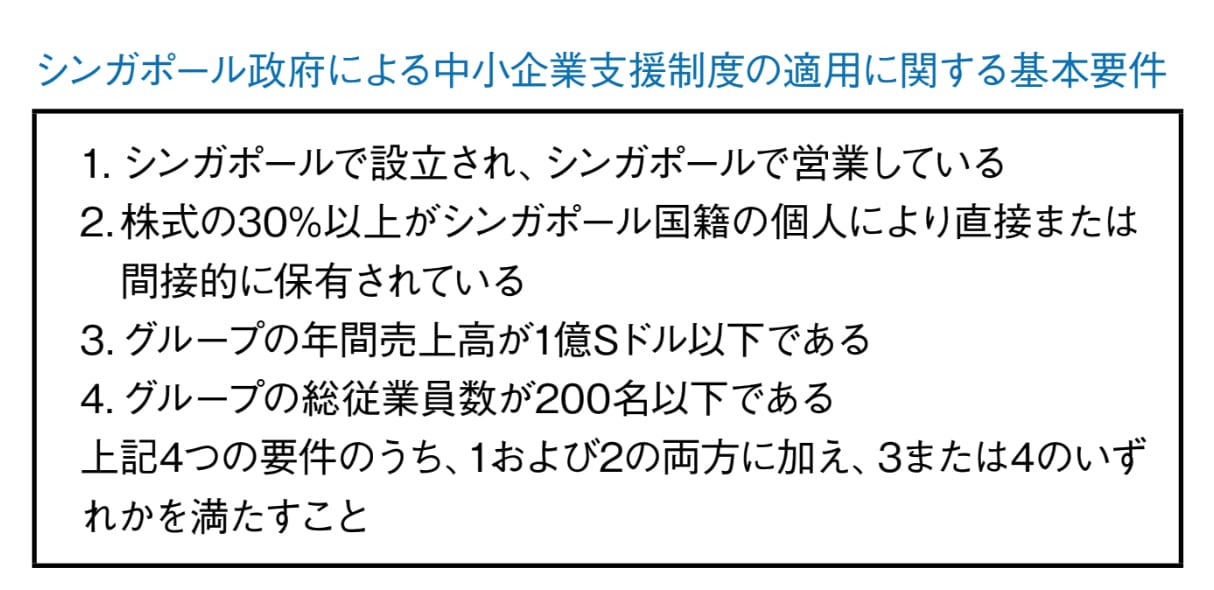 シンガポール政府は、差し迫る産業構造変革の荒波の中で、中小企業が技術革新を遂げ生き残れるように、様々な支援策を打ち出しています。ただ、これらの支援策の多くは、シンガポール国籍の個人株主が株式の30%以上を直接または間接的に保有していることが要件の一つとされており、日系企業が適用を受けるのは難しくなっています。