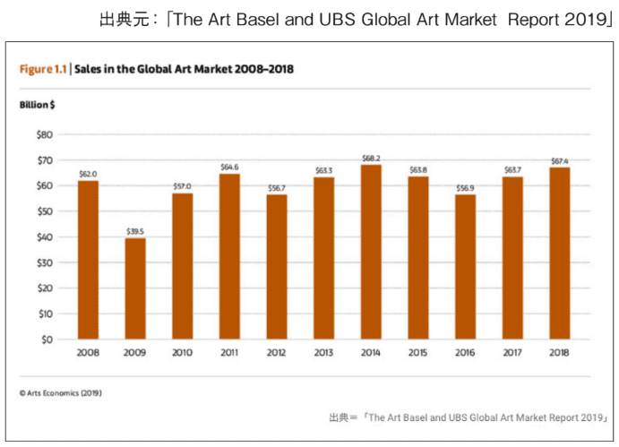 興味深いデータがある。世界最大級のアートフェア『アートバーゼル』とスイス金融大手のUBSが、2018年の世界の美術品市場は6%成長し、約7兆5,000億円(約674億米ドル)だとレポートした。市場のトップはアメリカ、イギリス、中国の3か国で、総売上高の84%を占める。米国は2%増で世界市場の44%のシェアを持ち、イギリスは21%で世界第2位の地位を取り戻し、中国は2%減少して19%のシェアで世界2位から3位へ後退した。