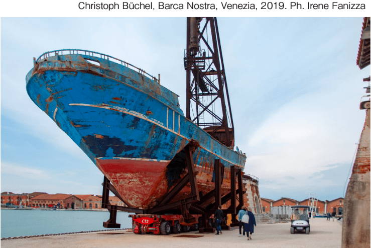 この作品、造形的な創作ではなく、実際に沈没した難民船を会場に運び設置したもの。2015年4月18日にリビアのトリポリから、リビアやアフリカの800人を超える難民を運んでいた船が、シリア沖で貨物船に衝突、沈没して多数の犠牲者を出した時のものだ。生存者はわずか71名。この衝撃的なニュースは世界中をかけめぐり、難民問題の深刻さを伝えた。その沈没船を引き上げ、ベニスまで運んで来るとは驚きだが、そのコストを考えると、難民救済に使った方が良いのではないかとシンプルに思ったりもする。最近のアートの国際展は審美的な価値よりも政治性が重んじられる傾向があり、絵画の展示が極端に少なくなった。それだけ人間が生き難い世の中になっているのだろう。今回のテーマには、こうした風潮に対する逆説的な意味が込められているのだと改めて思う。