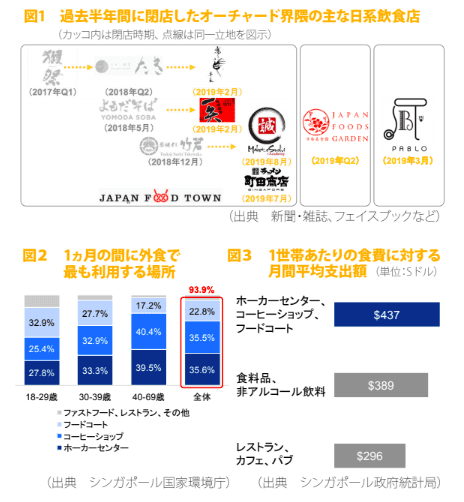 シンガポールで飲食店の閉店に遭遇することは日常茶飯事の光景であり、実際に飲食店の40%は出店してから5年以内に、28%は出店してから1年以内に閉店している点は、以前に本コラム『なぜシンガポールの飲食店の寿命は短いのか(2018年11月号)』にて考察した通りである。「うまい、やすい、はやい」に加えて顧客体験の優位性が飲食店の成否を握る点は不変の中、店舗の開閉店は相変わらず日常的である。図1に過去約半年の間にシンガポールの繁華街オーチャード界隈で閉店した主な日系飲食店を例示する。2016年7月に、官民ファンドのクールジャパン機構などが出資する日本食店街事業としてオープンしたジャパン・フード・タウン内の各テナント。伊勢丹オーチャード店の4階かつ同じフロアには集客力のあるフードコートが存在するという好立地ながら、そのフードコートとの間の価格差がマイナスに作用しているであろうこともあり、オープン当初のにぎわいを見せることはない。「本格的な日本料理を手頃な価格で提供し、現地消費者への日本食の浸透を図る」ことを目的に4年目の営業に突入したが、すぐ隣で現地系の「焼・すし」なる和食店が連日ファミリー連れや観光客が行列をなす繁盛店となっている一方で、テナントの改廃ばかりが目立っているのは皮肉である。