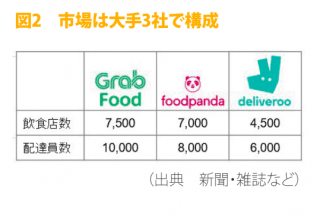 シンガポールで料理宅配サービスの市場が急拡大中だ。その規模は2017年の2億600万米ドル(約218億円)から2020年には4億1,800万米ドル(約443億円)と、3年間で2倍もの成長が見込まれている(図1)。市場を構成する主要3企業の筆頭は、シンガポールの配車大手グラブが展開するグラブフード(GrabFood)。グラブが2018年に米ウーバーテクノロジーズの東南アジア事業を買収したことに伴い、ウーバーが2016年から展開していたウーバーイーツ(Uber Eat)を引き継ぐ形で2018年5月からサービスの提供を開始。今では約7,500の提携飲食店と約1万人の配達員を擁する。グラブフードに続く2社はドイツに本拠を置くフードパンダ(Foodpanda)と英国に本拠を置くデリバルー(Deliveroo)。フードパンダは2012年からシンガポールでサービス展開をしている老舗で、約7,000の提携飲食店と約8,000人の配達員を擁している。一方のデリバルーは2015年にシンガポールに進出、約4,500の提携飲食店と約6,000人の配達員を抱えている(図2)。