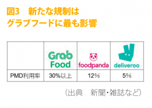 新たな規制により、今後シンガポールで電動スクーターを利用できるのは、国内の歩道総延長の10%にも満たない自転車専用通行帯のみとなる。電動スクーターはバイクや自転車と並んで料理宅配の主要な手段の一つであり、今年5月にはグラブフードが配達員向けに電動スクーターの定額利用サービスを開始、フードパンダが電動スクーターの地場スタートアップ企業テレポッド(Telepod)と提携するなど、料理宅配サービスのビジネスモデルには欠かせない存在になっていた。既に政府は大手3社と共同で支援基金を設けた上で、電動スクーターから電動アシスト自転車や自転車へ乗り換える配達員への支援措置を発表している。しかしながら、一部の宅配を電動スクーターに頼ってきた大手3社(図3)においては、配送オペレーションの抜本的な見直しが求められており、今回の規制にいかに対応していくのか、各社の動向に注目していきたい。