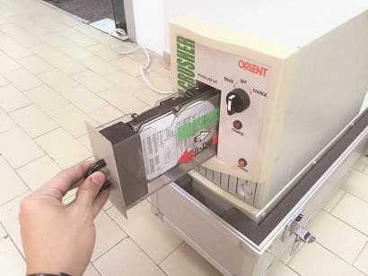 磁気データ消去マシンを使用して、強力な磁気を照射することによってハードディスク上の磁気に記録されたデータをわずか数秒で破壊、完全消去し、復元不可能な状態にします。