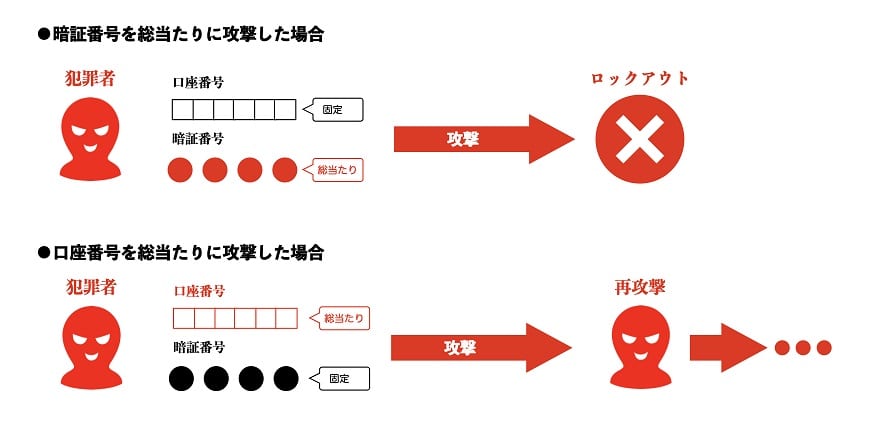 これらに加え、結果的にですが、サービスを不正に利用した犯罪者に口座番号や暗証番号、あるいは口座の情報を盗まれていた形になります。この情報の流出経路は明確ではないですが、リバースブルートフォース(図2)などの手段で盗まれたのではないかと言われています。もちろんこれは、可能性の一つです。