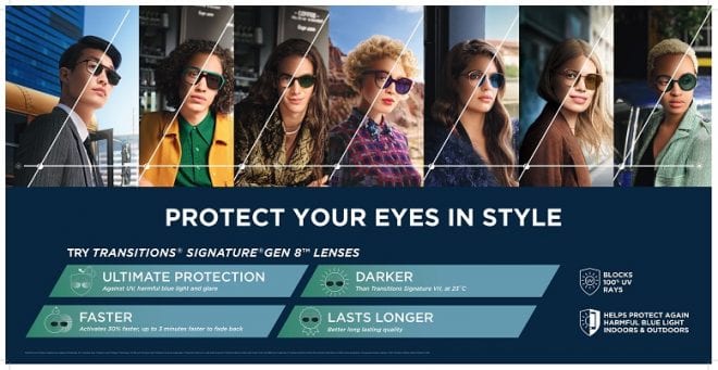 また、UV光線から目を守るUVカット機能も備えている。カラーを選べる楽しさが加わった、新しい「Transitions Light Intelligent Lenses」をぜひ店頭で試してみて欲しい。