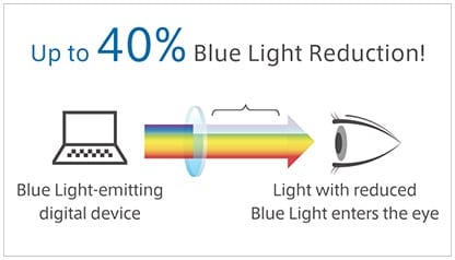 青い光(ブルーライト)とまぶしさから目を守る高度なブルーライトカットレンズ。このレンズは、電子機器や環境から発せられる有害な青紫色光を最大40%フィルタリングし、夜間に視界を乱す可能性のある眩しさを低減する反射防止コーティングも付属している。