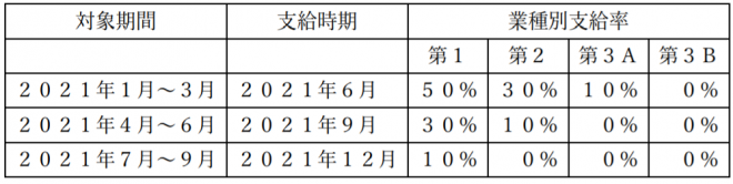 従業員の雇用を維持するために昨年度予算案にて導入されたJSSは、対象業種を絞って2021年9月まで継続されます。2021年に関する支給は以下の表の通りで、シンガポール国籍および永住権者の従業員の月額総賃金のうち4,600Sドルまでが支援の対象となる点は従来通りです。2021年1月より、第3業種のうち新型コロナウィルスによる影響が少ない一部の業種(生物医学、情報通信、スーパーマーケットなど)は第3B、それ以外の業種は第3Aに細分化されました。