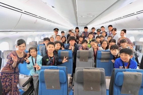 その考え方を基盤に、シンガポール航空が名古屋就航30周年を迎えた2019年10月、地元の小学生29人を中部国際空港へ招き、「小学生社会見学会」を開催しました。子供たちに新しい経験をしてもらう機会を設け、将来、世界で活躍して欲しいという想いで、最新機材ボーイング 787-10の機内見学や、客室乗務員の指導のもと英語を含む機内アナウンスを体験、ビジネスクラスの試食で洋食の食事の仕方や名刺交換などのビジネスマナー教室を開催しました。