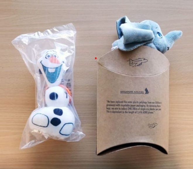 お子様向けのおもちゃの包装にプラスチック袋の使用を廃止し、再生紙を使用しています。またシンガポール航空グループのスクートでは、2020年12月から機内で提供するペットボトルの水を、主に紙やFSC認証記号*を受けた素材で作られた包装のものに変更して提供しています。