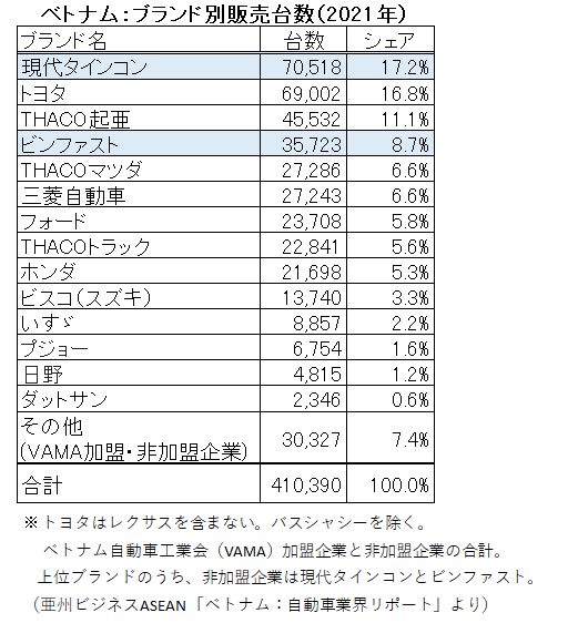 ビンファストは19年半ばに自動車生産を開始したばかり。自社工場を北部ハイフォン市に構え、年産能力は25万台。現在はエンジン車を製造・販売している。EVは21年から22年にかけて国内外で発売する予定となっている。[「亜州ビジネスASEAN」 1月9日付ニュース]