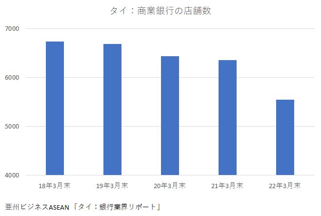 タイ中央銀行の集計によると、2022年3月時点の商業銀行29行(外資系銀行を含む)の支店数は5,553店だった。新型コロナウイルス流行を背景に、デジタル化が進展したことなどを受け、1年間で801店減少した。