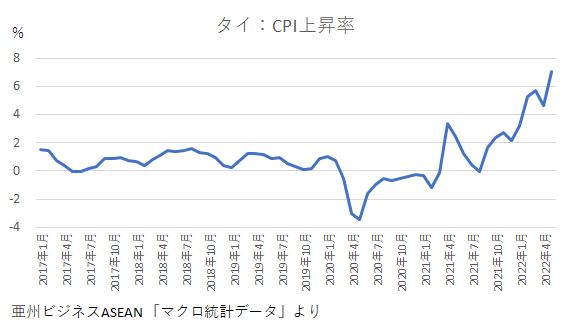 以上、食品・エネルギー分野のダメージを述べてきたが、結局のところは物価上昇の問題に行きつく。アセアン各国はすべて、インフレの進行に悩まされている状態だ。最後に、約14年ぶりのCPI上昇率を5月に記録したタイの物価動向を伝える。