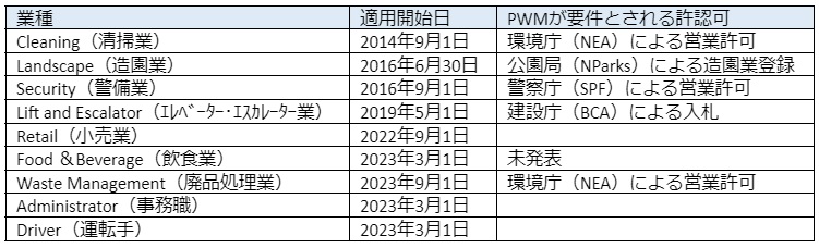 清掃業・造園業・警備業・エレベーターエスカレーター業については既に導入済ですが、今後新たに小売業・飲食業・廃品処理業にも順次導入されていく予定です。また、これらの業種別漸進的賃金(PW)とは別に、職種別PWとして、事務職および運転手にも2023年3月1日より適用が開始されます。