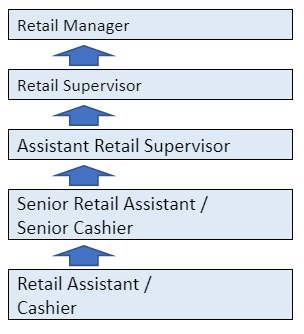 A. シンガポール人材開発省(MOM)は、小売業のキャリアステップとして、以下の5段階を設定しています。ここで使用されている名称は、あくまでもそれぞれの職能の目安を示すもので、各事業主により独自の名称を使用しても問題ありません。