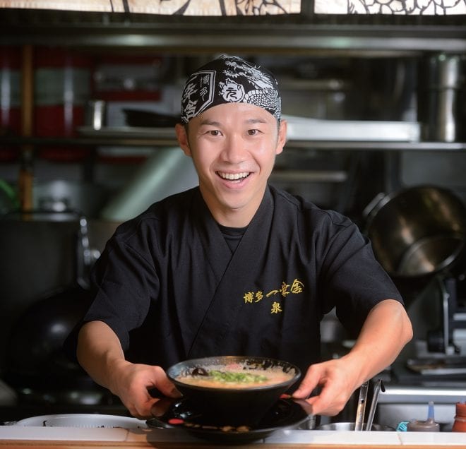 学生時代は、博多祇園山笠、富士山登頂、心の赴くままにいろいろチャレンジした。ホノルルマラソンも「やると決めたら必ず絶対やり遂げる」という自身の哲学を貫き、完走。初の海外経験は世界を意識するきっかけになった。ラーメン好きの仲間と連れ立ってよくラーメンも食べ回った。「博多では景気良くても悪くてもラーメン。ラーメン嫌いを見つけることが難しい。これは商売に繋がるはず」。職人気質の父親の起業への強い勧めも、夢に拍車をかけた。好きなことで起業、だったら福岡で一番のラーメン屋。社員募集もしていない博多一幸舎の門を叩き、飛びこみで雇ってくれ、と社長に直談判した。必ず成果を出すと決意。昼夜問わずひたすらラーメンのことを考えた。電車の中で湯ギリを練習、休みの日も一日7件ぐらいラーメンを食べ歩いた。