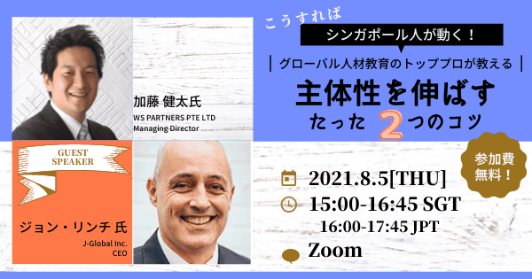 本セミナーでは、J-Global社のCEOジョン・ジェームス・リンチ氏と共に、シンガポールの文化的な特徴を踏まえた上で、ローカル人材の主体性を高めるためのコツをお伝えします。