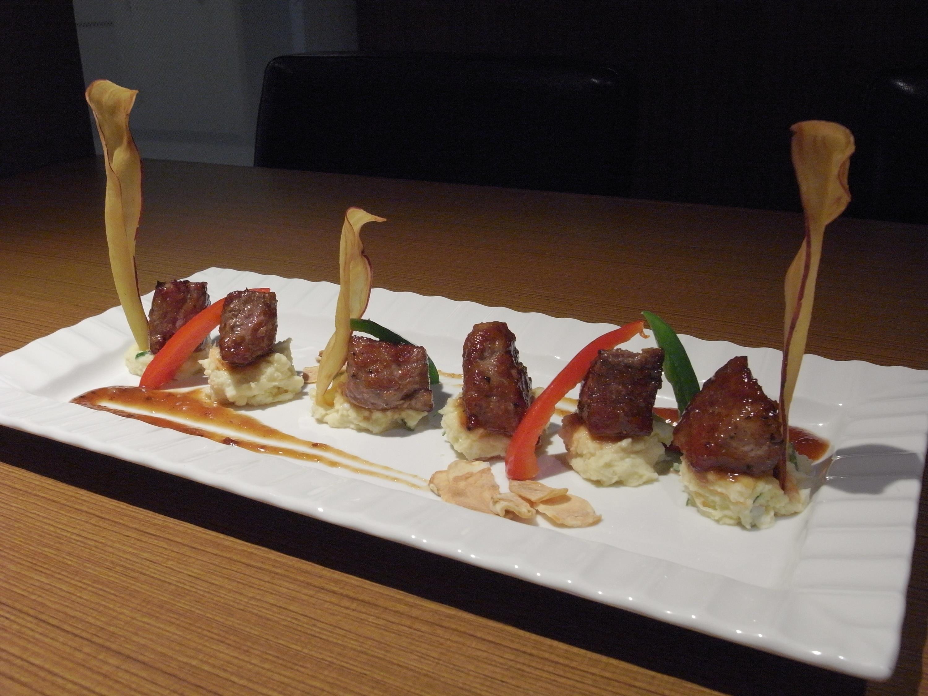 おすすめの料理はまず、和牛ヒレ肉の和風サイコロステーキ(29Sドル)。肉汁をたっぷり含んだジューシーなステーキが、一個ずつポテトサラダの上に乗って出てくる。サツマイモチップスや2 色のパプリカが添えられた姿は芸術作品のよう。リンゴや白ネギ、ワインなどを使ったしょうゆベースのまろやかなソースが肉の旨味をさらに引き立てる。