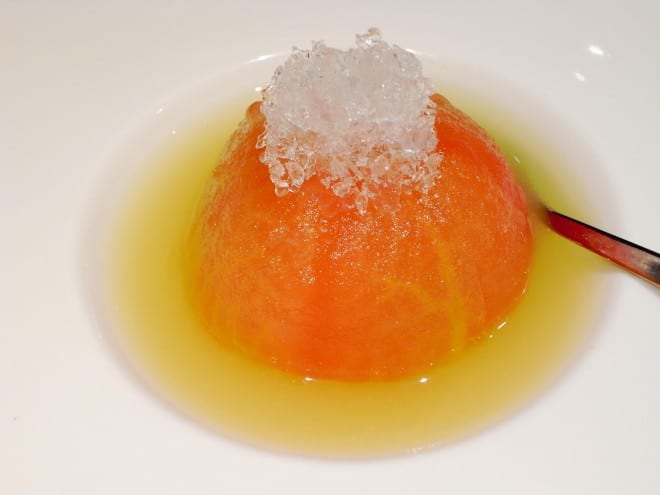 前菜やデザート、どちらでも楽しめるのが桃太郎とまとの柚子マリネ(12Sドル)。湯むきした甘いトマトを爽やかな柚子果汁に漬け込んだ一品で、熱烈なファンも多いという。