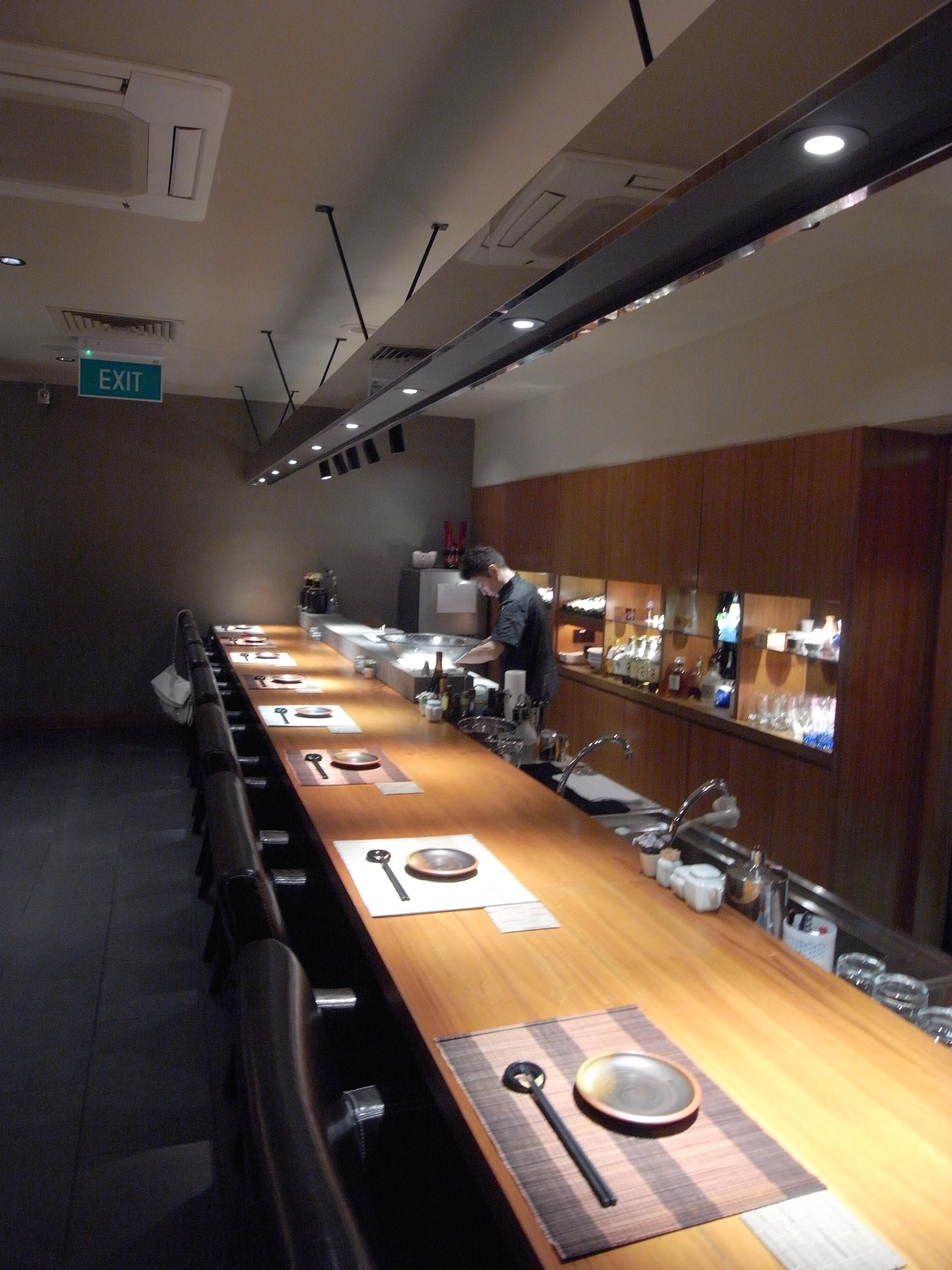 コース料理は100Sドルからおまかせで注文可能。接待などの時に利用できる個室もある。落ち着いた照明の下、大きめの椅子が並ぶカウンター、そしてテーブル席がゆったりと配置されているのもこの店の特長で、雰囲気にこだわる人にもおすすめできる。平日に仕事帰りはもちろん、日曜日も営業しているので家族との外食にも便利な1軒だ。