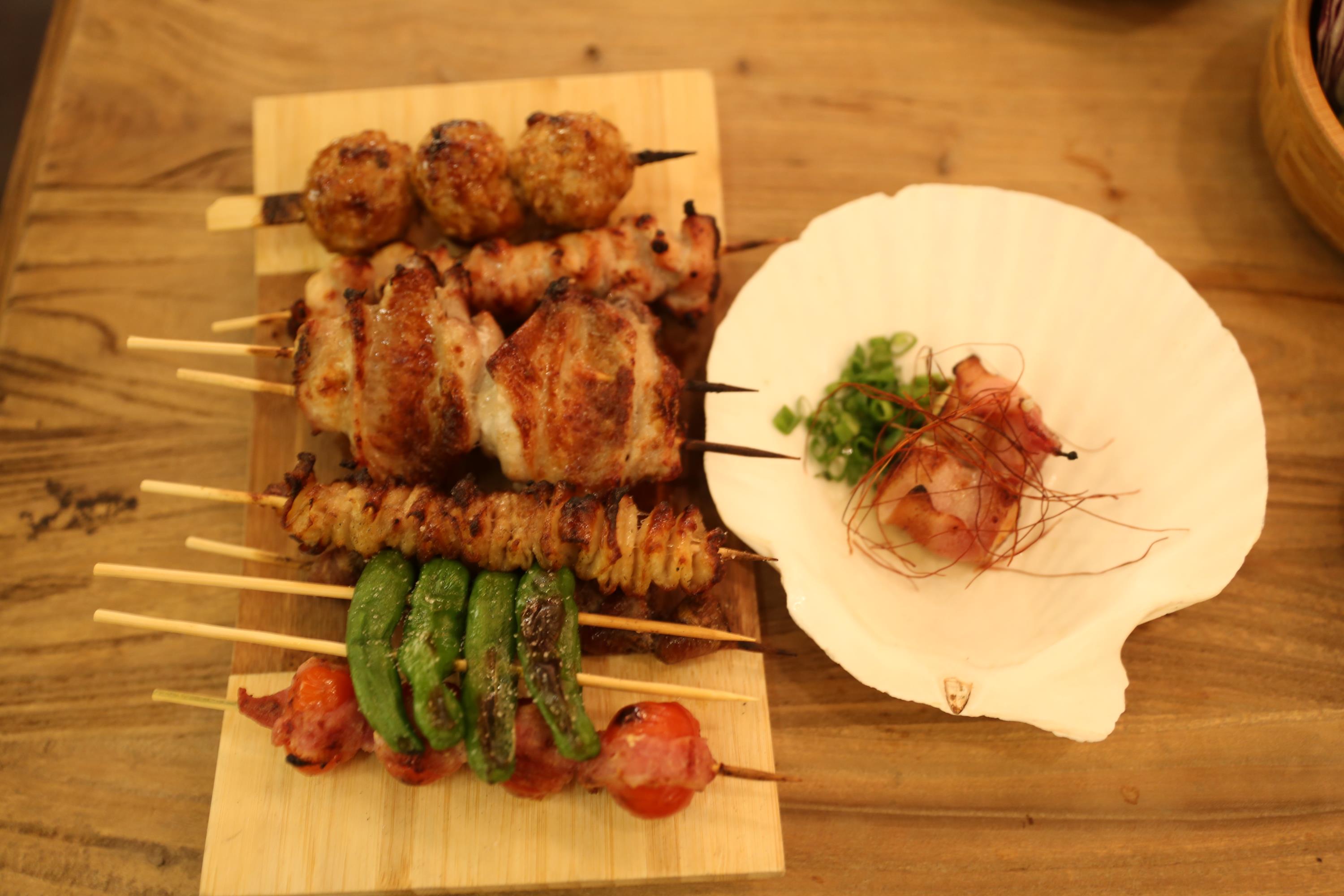 名物料理の串焼は炭火で焼きあげ、ジューシで食べると口の中で味がほとばしる。焼鳥、つくねのサイズが大きく、満足感たっぷり。そのほか塩辛チーズ、おでん、唐揚げなど定番の居酒屋メニュー、みずみずしく、厚切りで食べ応えがある刺身も提供する。さらに、刺身用の鮮度抜群のホタテとモツァレラチーズ、明太子を炙った帆立明太焼、イカ「黒」揚げ、アスパラ牛肉巻揚げといった同店ならではの工夫を加えた料理も勢ぞろい。