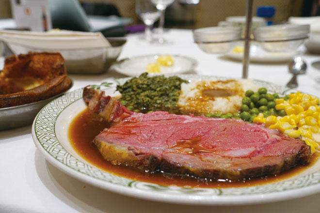 創業当時から変わらない銀色のカートをテーブルまで運んで来て、すぐ隣で切り分けてくれる。日本人一番人気の焼き加減は“ミディアムレア”とのことだが、リクエストすれば一番適した焼き加減の部分をカットしてくれる。大きさも、カリフォルニア・カット(160g:S$80++)、イングリッシュ・カット(200g:S$95++)、ロウリーズ・カット(285g:S$120++)、そして肉厚でボリュームたっぷりのダイアモンド・ジム・ブラディ・カット(450g:S$170++)からお腹の空き具合によって選ぶことができる。肉の旨味を増すため熟成に最低21日かけ、約4時間かけてじっくりローストした肉は、非常にジューシーで柔らか。肉本来の深い味わいを堪能できる。また、プライムリブを注文するとサラダ、マッシュポテト、ヨークシャー・プディングが無料で付いてくる。サラダはLawry’sオリジナルの制服を着たウエイトレスが、カートに材料を乗せてテーブルまでやって来て、氷の上に乗せたボールをくるくる回しながら、ドレッシングを高々とあげて目の前で作ってくれる。お皿もフォークも良く冷えていて、サラダもシャキシャキとした歯ごたえだ。ヨークシャー・プディングは肉汁を少しだけ付けて食べるのがオススメ。ふわふわした食感と表面のパリパリ感がソースと良く合う一品。また、サイドにクリームコーン、グリーンピースのバターソテー、ほうれん草のクリーム煮の三点セット、シルバー・サイド・トリオ(S$15++)をオーダーするのもお忘れなく。肉の上に乗せて一緒に食べても美味しい。また、平日ランチ時は現在プロモーション中のウィークデー・パワー・ランチ(S$58++)がオススメ。デザートとコーヒーも付いてくる。ランチセットメニューは毎月変わり、パスタやチキンも登場するそうなので、こちらも要チェック。