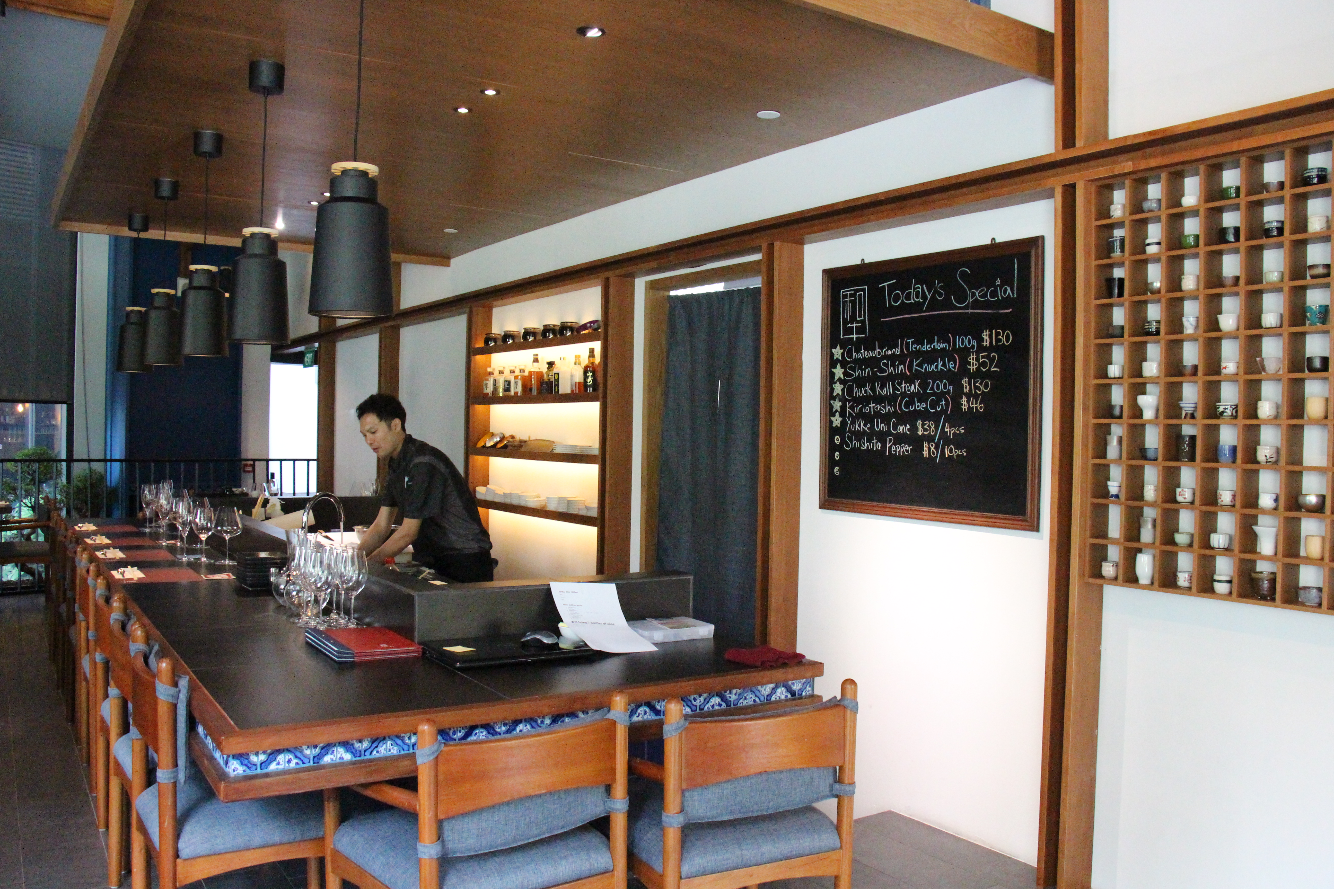 今年3月にオープンした「THE GYU BAR」。ノボテルとメルキュールホテルに隣接し、優雅な雰囲気が流れる店内では、熊本県産和牛を使った焼き肉、焼きしゃぶ、ステーキ、そして牛肉以外は90%が日本産というこだわりの食材を用いて、日本人シェフが腕をふるっている。