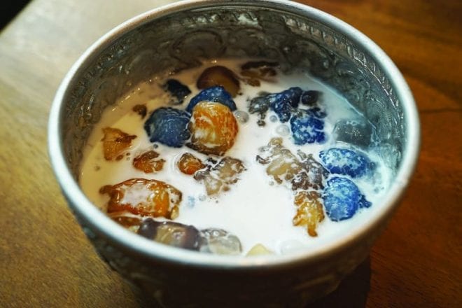 色づけは食紅ではなく、バタフライピーやハイビスカスなど天然食材を使用している。お口直しにぴったりの味。