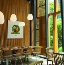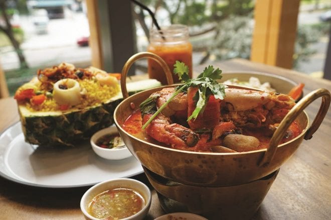自然光が降り注ぐ店内は、明るくモダンな雰囲気。ガラス張りの窓からは景色が楽しめる。大テーブルには16人が一緒に座れるという。ビジネス仕様の場合はコーナーの席を用意したり仕切りを置いて対応してくれるというので、是非リクエストして欲しい。また、25人以上だとビュッフェメニューも可能(S$30++,S$35++, S$40++)で、予算を言えばスペシャルメニューも提供してくれるそうだ。カレーやトムヤンクンなどは辛さも選べ、辛いものが苦手な人も一緒にタイ本場の味を楽しめる。