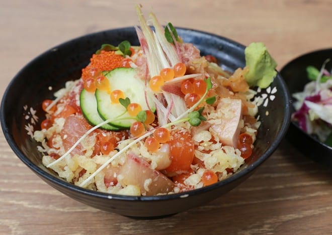 すしと並ぶ名物がチラシ丼。刺身にイクラ、海鮮たっぷりでこちらも17Sドルとリーズナブル。シェフ特製のたれであらかじめ味が付けられており、醤油を足す必要がない。これは、ビジネス街に近い場所柄、急いでランチを済ませたいお客さんのことを考えての配慮なのだそうだ。