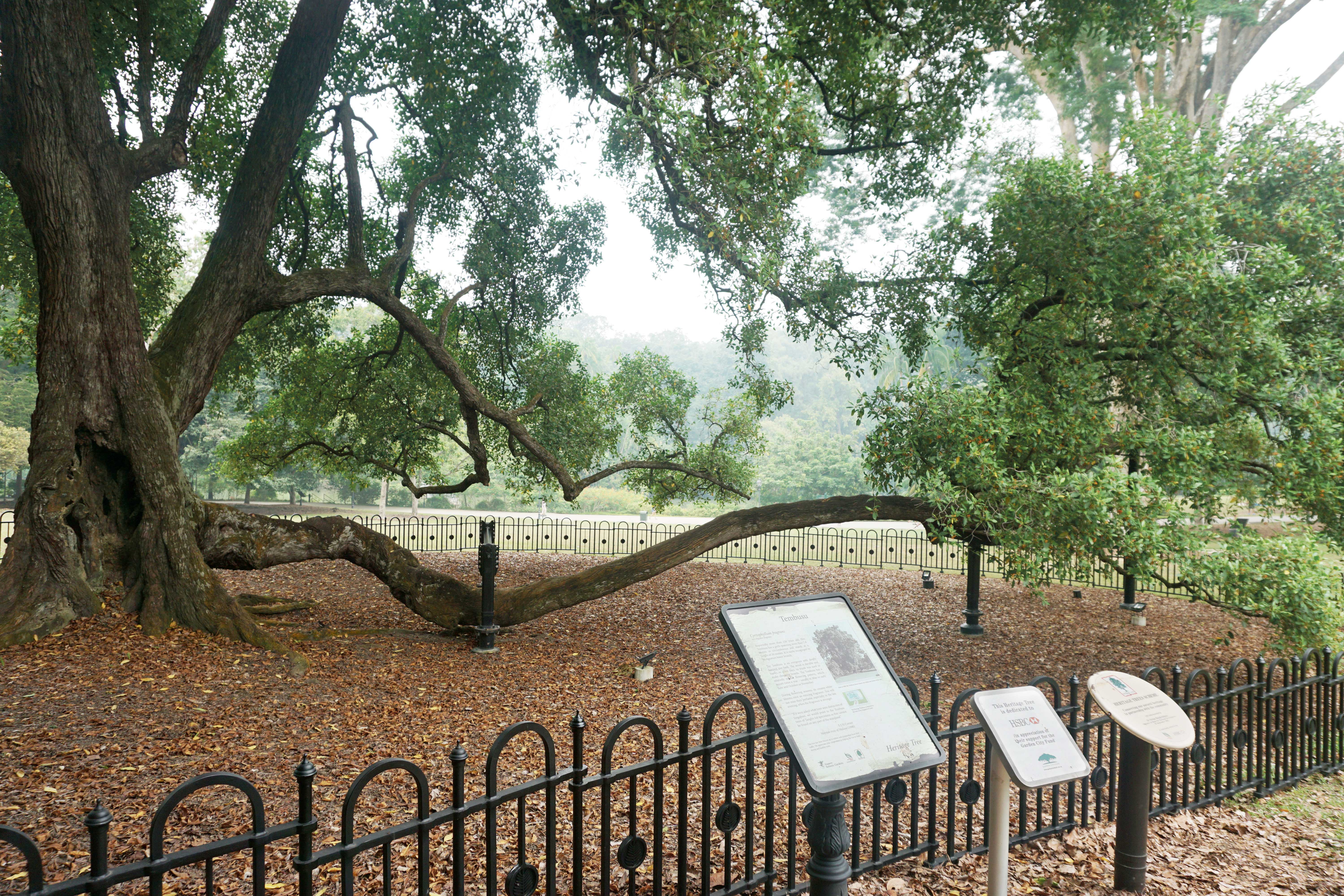 オーチャード寄りにあるタングリンゲートから入ってすぐの芝生に植えられているシンガポール原産の木、テンブス(Tembusu)。横に大きく伸びた枝が特徴のこの木は、シンガポールの5Sドル札の絵柄にもなっており、シンガポール人にとって馴染みの深い木です。樹齢180年を超えるこの木は特別天然記念樹(ヘリテージ・ツリー)に指定されており、1950年代頃までは地元の家族が集まって枝に座り、集合写真を撮るのが習慣だったそうです。ここで撮影した家族写真が飾られた家も多く、若い世代のシンガポール人にとっても自分を可愛がってくれた祖父母を思い出すノスタルジックな木だと言います。