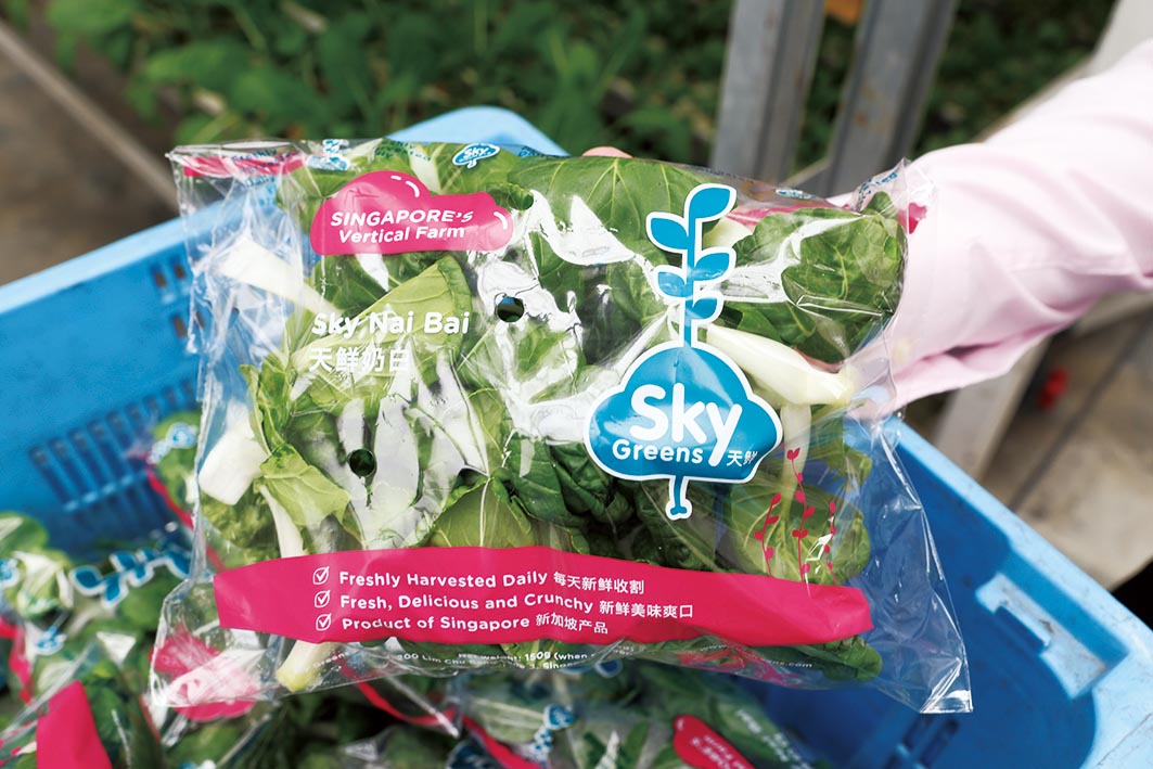 フェアプライス・ファイネストなどで購入できる同社野菜のパッケージ。立体式というめずらしい栽培方法のため、値段は輸入野菜よりわずかに高いが(比較例:輸入野菜1.50Sドル、同社野菜1.80Sドル)、新鮮さと安全性は折り紙付き。