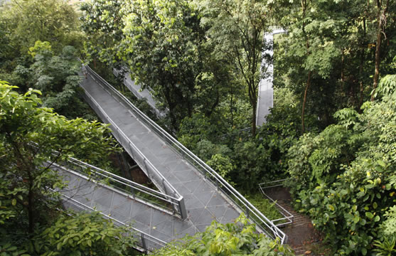2008年5月に完成したサザン・リッジは、2000年代初めに、この一帯の丘ごとにある公園を遊歩道でつないで、人々が自然散策を楽しめるルートにしようという計画が都市再開発庁(URA)で浮上したのが始まり。MRTハーバーフロント駅の出口Dから地上に出てすぐのメラン・ロードがサザン・リッジの東のスタート地点、メラン・トレイル(Merang Trail)の入り口へと続いています。木立の間に作られた、ところどころ階段もある道をしばらく歩いていくと、マウント・フェ―バー・パーク(Mount Faber Park)に着きます。スタート地点からの標高差は70メートルほどですが、階段が効果的に配置されているためか登りのきつさをほとんど感じません。