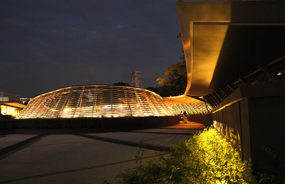 日没直後の宵闇に浮かび上がったドビーゴートグリーンのアンフィシアター。ラタンバスケットをイメージしたデザインであることがわかる。
