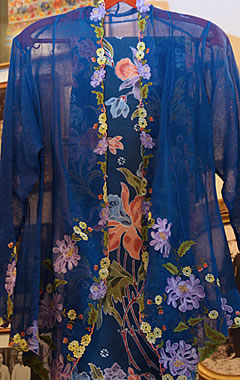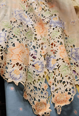 そのクバヤを一目見たピーターさんは、そのカッティング、刺繍の施し方などから、「古いものですね。1920年代くらいにインドネシアで作られたものでしょう。」とまず一言。「刺繍が素晴らしい。ちょうどシンガーの足踏みミシンが普及し始めた頃のもののようです。前身頃のすそは、長く尖った三角形で、そこに網の目のようなホールカットと花々の刺繍が施してある。典型的なクバヤ・ケラワン(Kebaya Kerawang)といわれるスタイルです。」すらすらとピーターさんの見解が続きます。ババ(プラナカンの男性)であるピーターさんは、プラナカンの陶磁器、サロン・クバヤ、ビーズ細工のスリッパなどのアンティークコレクターとして知られ、プラナカン博物館や、ババハウスなどのコンサルタントでもあり、説得力も十分です。