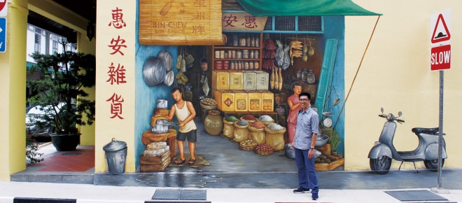 2015年8月から活動を始めた壁画アーティストのイップ・ユーチョンさんは、カンポン・グラムにあるリトアニア人のアーネスト・ザッカレビクさんの壁画を見て、自分が20年暮らす街角に懐かしい風景を描き留めようと思ったといいます。エバートン・ロードに描いたプラナカンの暮らしやショップハウスの食材屋をはじめ、チョンバル地区には70年代のホーカーや市場の様子、居間でくつろぐ人など往時を忍ぶ光景を生き生きと描いています。実物大に近い、程よく奥行きを持たせた描き方が、通り過ぎる人を壁画の一部にしてしまうかのようで、見る人が思わず近づいてしまうのもうなずけます。
