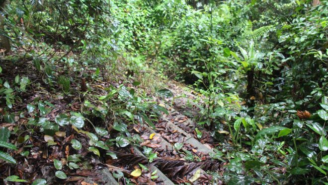 貯水池のほとりに佇み、橋桁は見えないかと水面に目を凝らしていると、次第に橋の向こう側、対岸のジャングルが気になってくる。