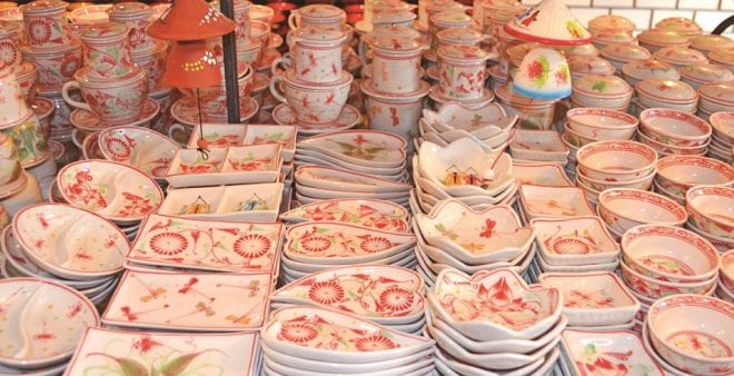 焼き物の名前は「バチャン焼」。ベトナムの首都ハノイ市内の中心部から南東に約14キロ、ホン川(紅河)沿いに位置するバチャン村で作られている磁器です。バチャン焼は500年以上も続く、ベトナムを代表する伝統工芸品のひとつで、ベトナム国内をはじめ、アジア、ヨーロッパ、米国などで幅広く使われています。