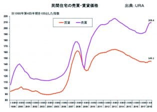 右の「民間住宅の売買・賃貸価格」のグラフをご参照ください。ピンク色の折れ線グラフは売買価格の指数で、2017年央から急騰してい