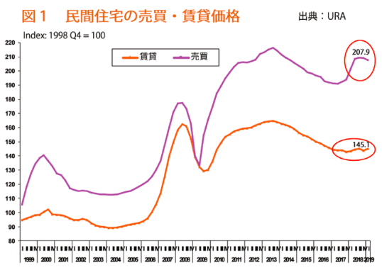 図1をご参照頂ければ、一目瞭然。赤丸で囲んだ部分にご注目ください。紫色の線は売買価格、赤色の線は賃貸料の指数です。上昇を続けてきた売買市況は失速し、賃貸市況も2019年第1四半期末6.3%という極めて低い空室率にもかかわらず、賃料上昇の勢いは極めて弱くなっています。