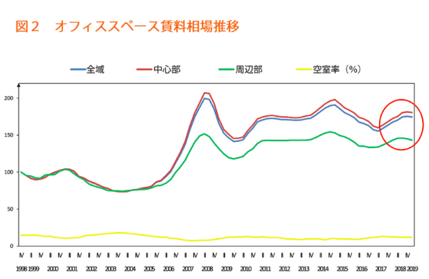 図2をご参照ください。直近では、2017年第2四半期を底として、2018年第3四半期までに、約12%上げ戻しましたが、その後の頭打ち・失速は見ての通り。青の線は全地域の賃貸相場平均値の推移、赤は中心部での推移、緑は周辺部での推移、一番下の黄色い線は空室率の推移です。