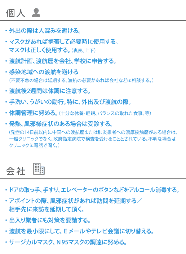 1月29日時点ではシンガポール島内での二次感染が報告されていないため、今のところ海外への渡航と帰国者への対応を中心とした対策が考えられます。