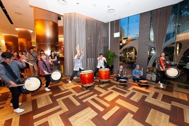 響屋シンガポールの和太鼓パフォーマンスで盛大に幕を開けたあと、約50名が集まった山口県とのライブ中継を通じて一斉乾杯。参加者は、同ホテルのシェフ、ミルコ・ヴィンチ氏がアレンジしたイタリア料理+シンガポール料理、鰻や味噌を使ったピザなどと日本酒のペアリングに舌鼓を打った。