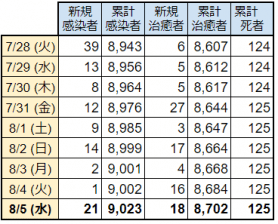 マレーシア保健省(MOH)は8月5日、新型コロナウイルス「Covid-19」の感染者数が前日から21人増えて9,023人になったと発表した。