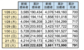 マレーシア保健省(MOH)は2月2日、新型コロナウイルス「Covid-19」の新規感染者数が前日から3,455人増加したと発表した。6日ぶりに3千人台に減少した。アクティブ感染者数は4万7,847人で、累計感染者数は22万2,628人となった。